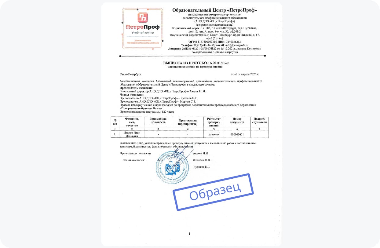 Слушатели, окончившие профпереподготовку, также получают протокол об обучении. В протокол включены данные об успешном прохождении аттестации, уровне знаний и компетенций специалиста, его квалификации, а также сведения об ученике и преподавателях образовательного центра. Документ юридически закрепляет окончание курса профессиональной переподготовки по выбранной программе. Вся информация передается в реестр Минтруда.
